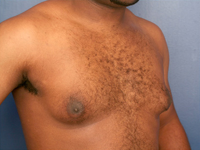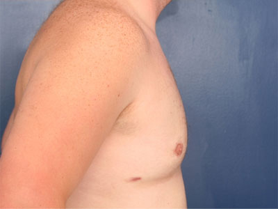 Before and after photos of this 38 yr. old man with severe gynecomastia. He has fibroglandular gyno and stretched out skin that will not shrink on its own. He is seen after correction using a full excision of skin and gland, liposuction and nipple graft placement.